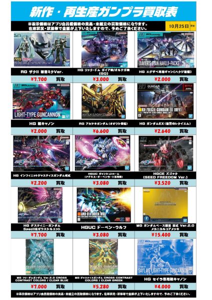 新作・再販ガンプラ買取表 買取金額